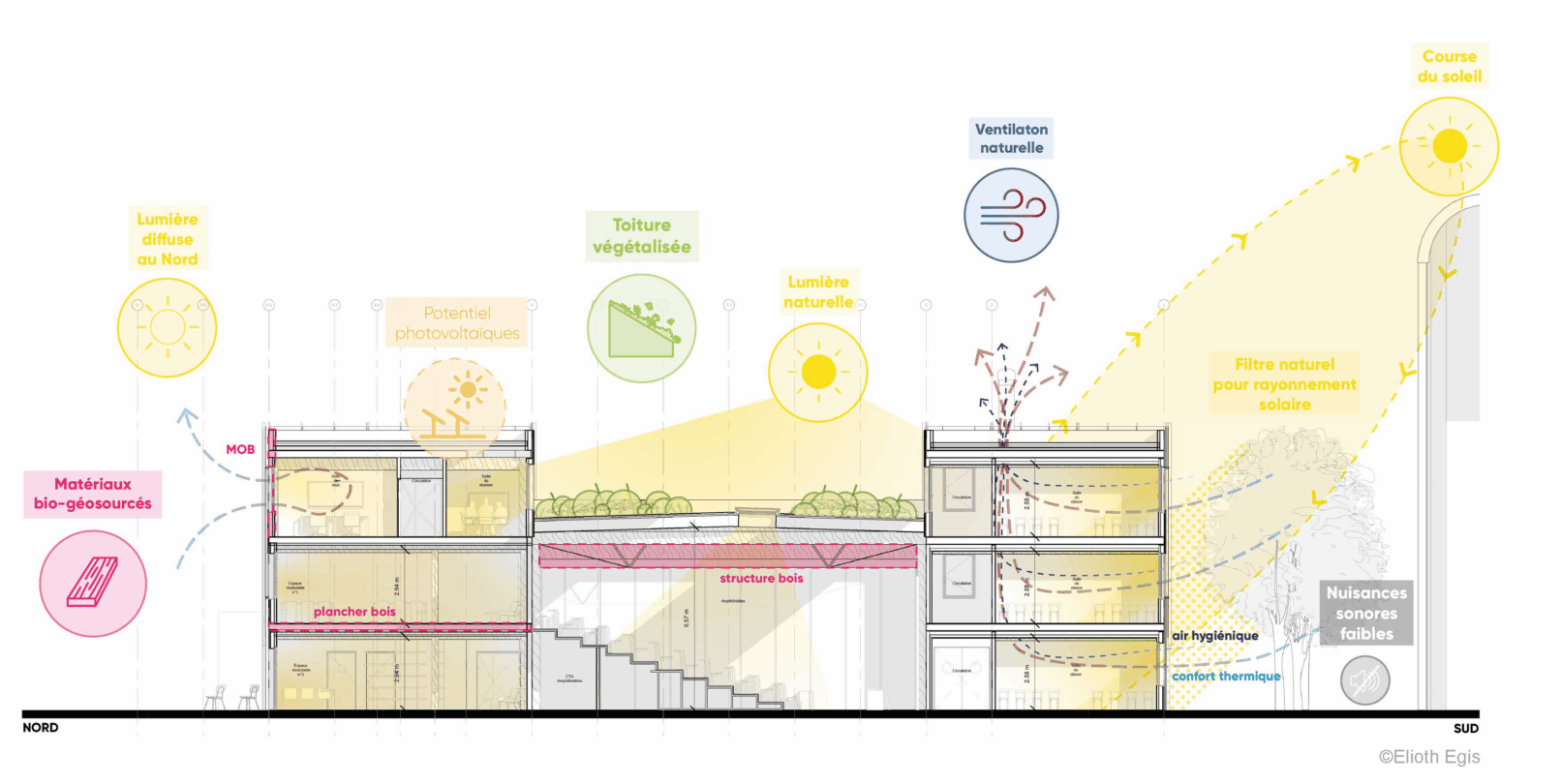 The building embraces a bioclimatic, low-tech, and low-carbon approach. Entirely prefabricated off-site, it combines two timber construction systems: