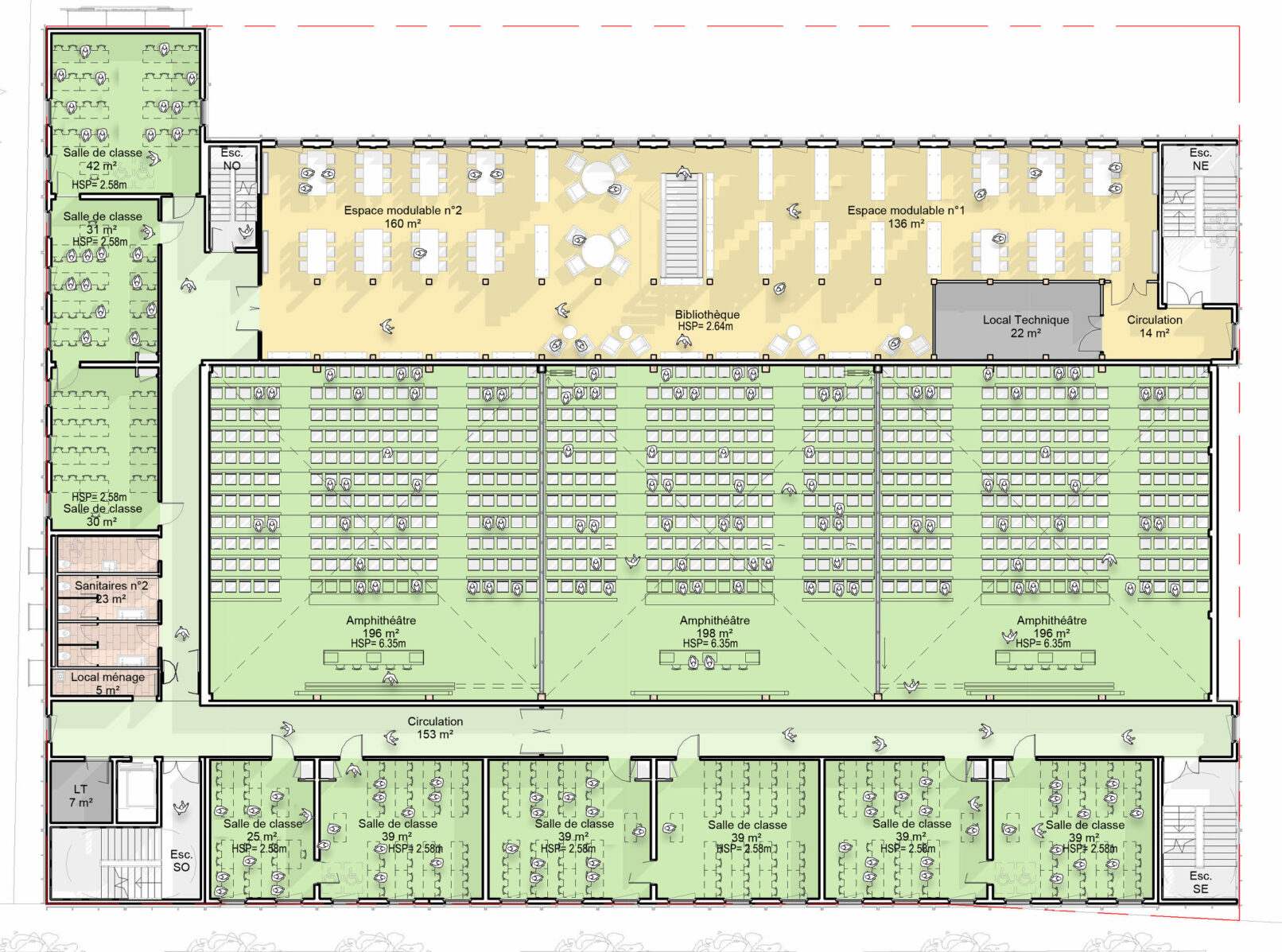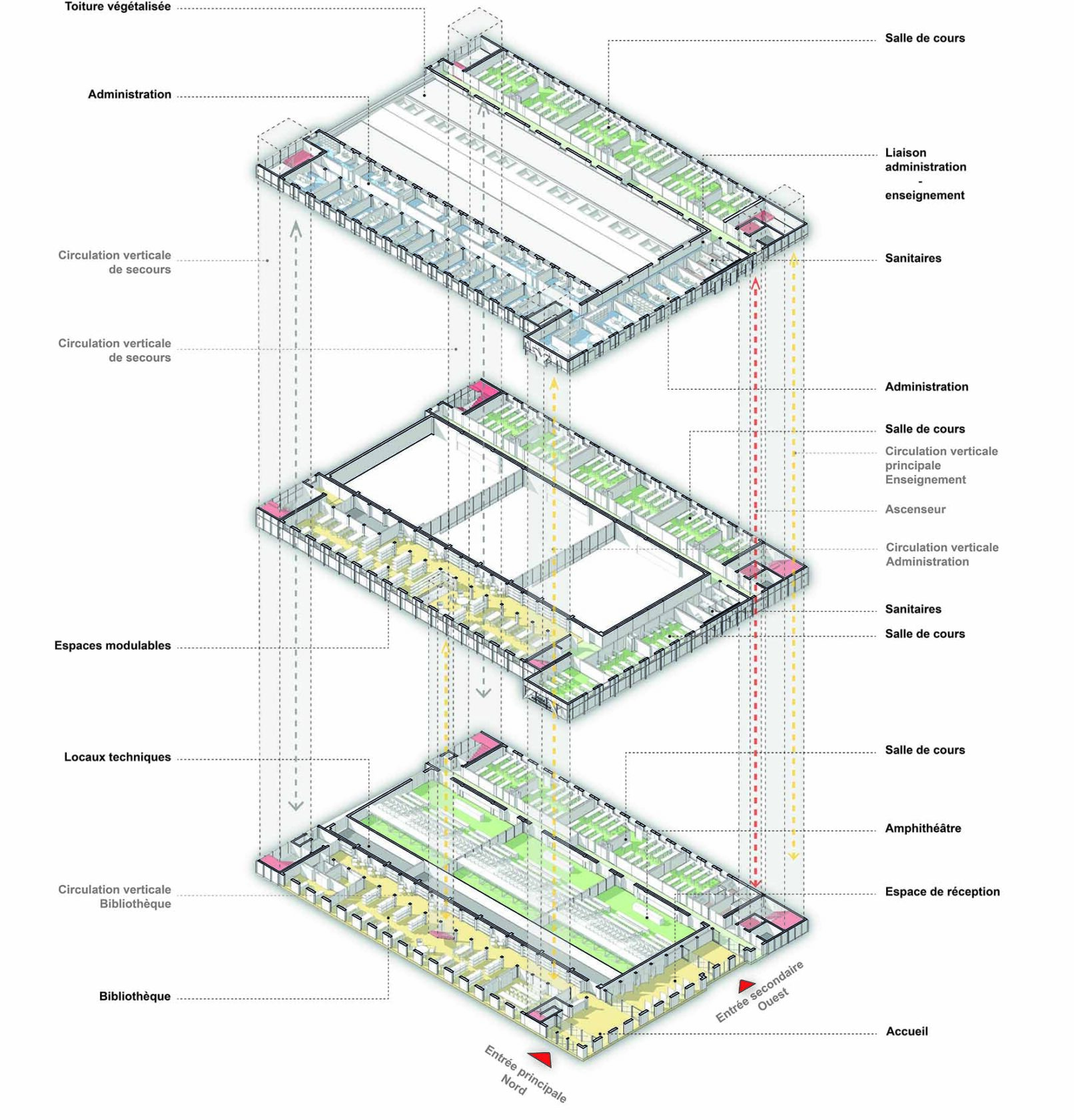 Designed for rapid assembly and to meet current educational needs (3,200 m²), the project aligns with the École Polytechnique’s climate commitments. It is conceived as an evolving structure, with key elements that can be dismantled and reused in future scenarios.