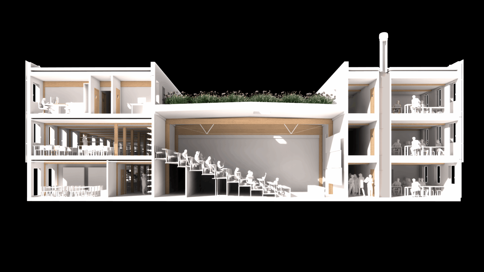 At the heart of the project, three 200-seat lecture halls are designed to be fully demountable and relocatable elsewhere on campus. Once removed, these spaces can be transformed into open office areas facing a planted courtyard with soil in direct contact with the ground.