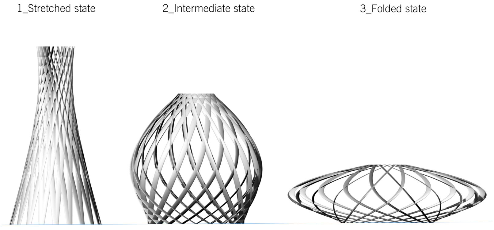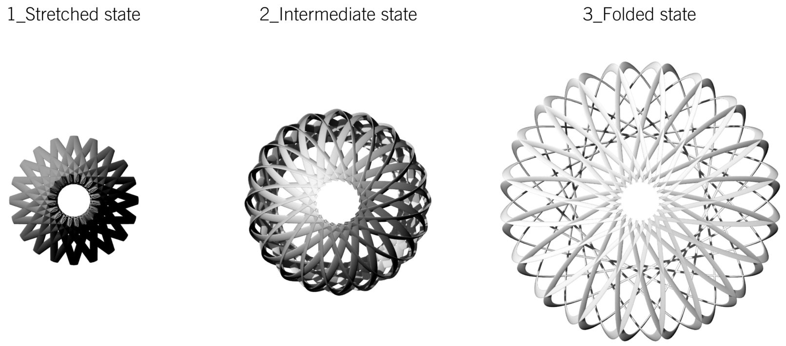 Creating an actuated structure is always a challenge for architects. In order to design a pavilion whose ever changing shape can adapt to different uses, a foldable geometry inspired by a Chinese puzzle weawing pattern has been explored. The pavilion geometry has been scripted dynamically from full folded state to unfolded shape using Rhino + Grasshopper.