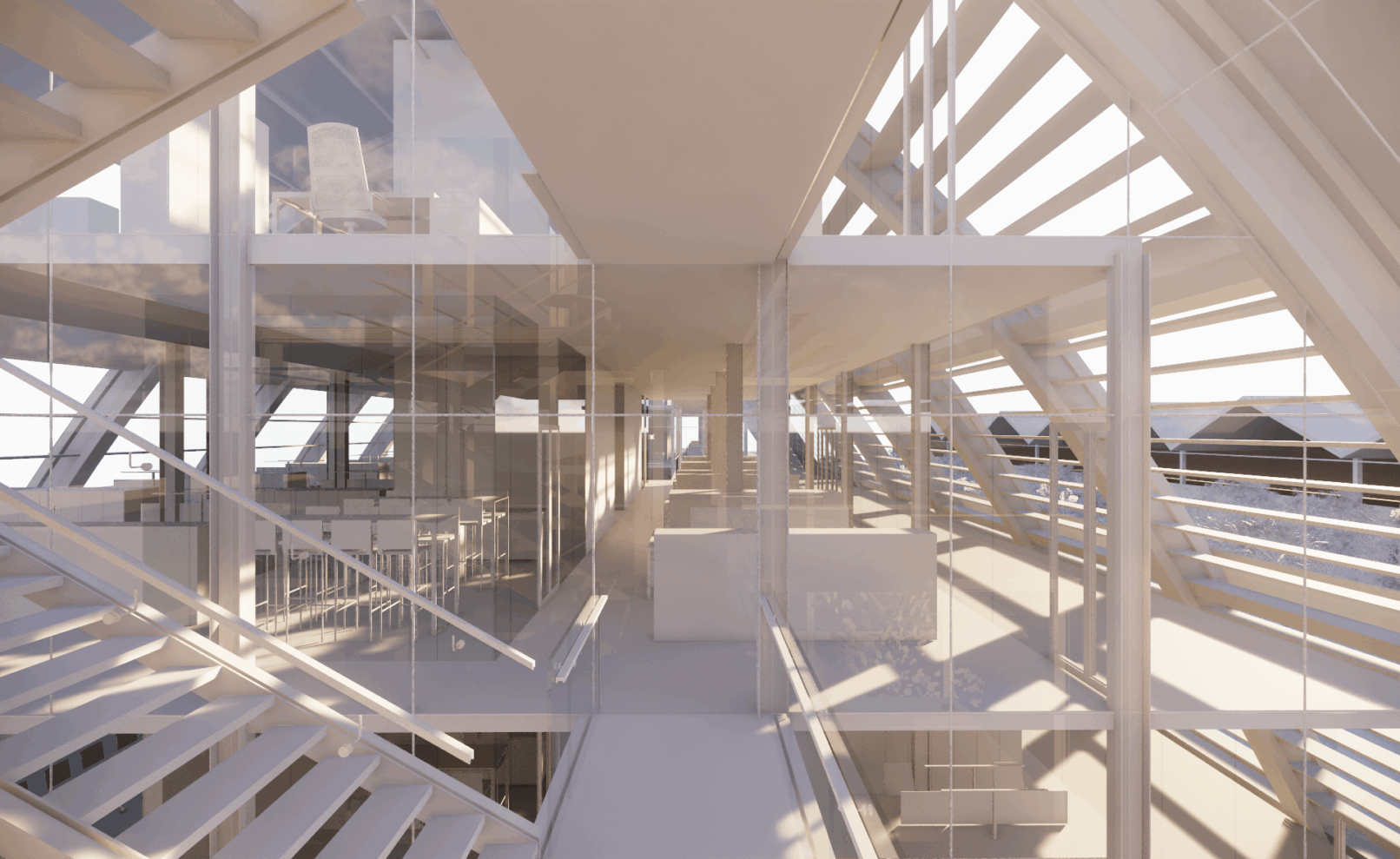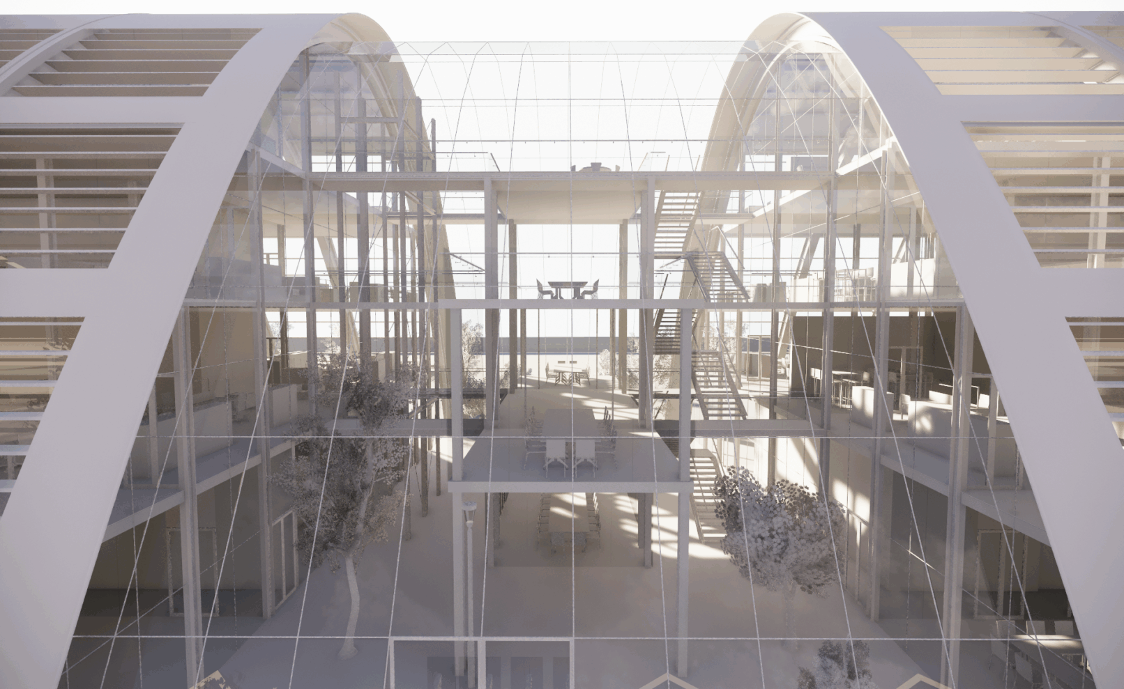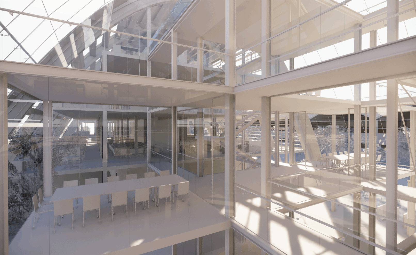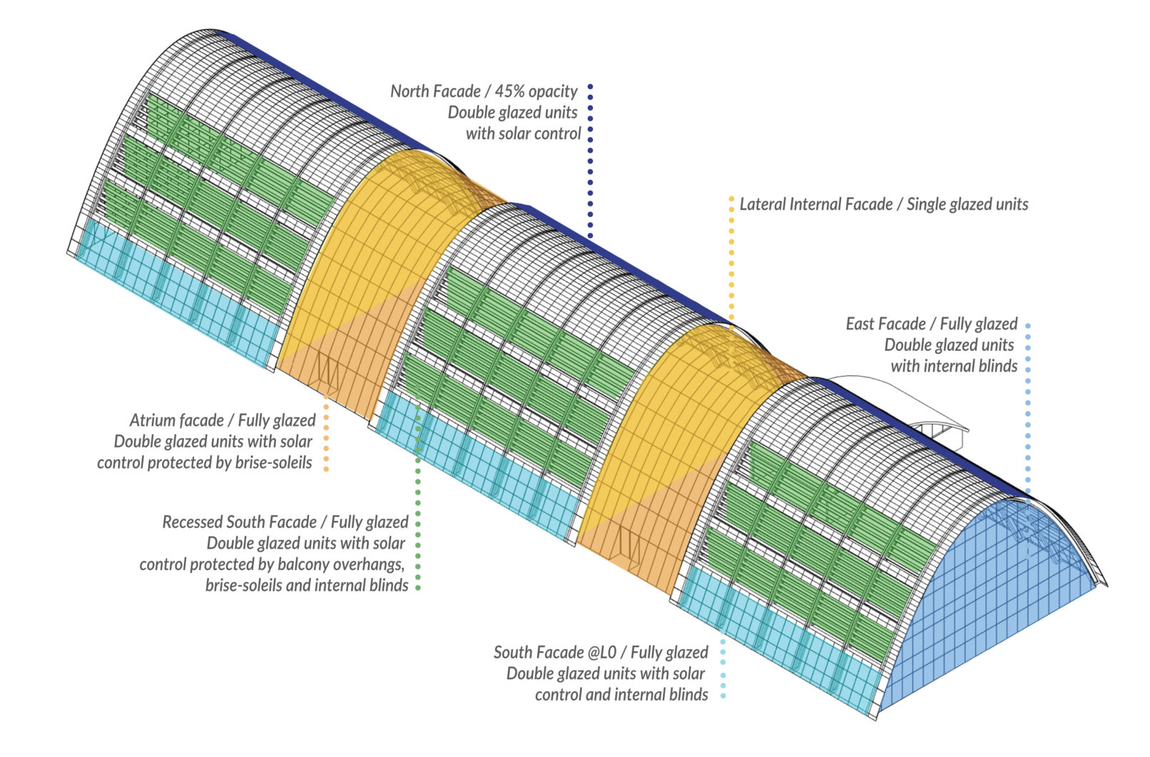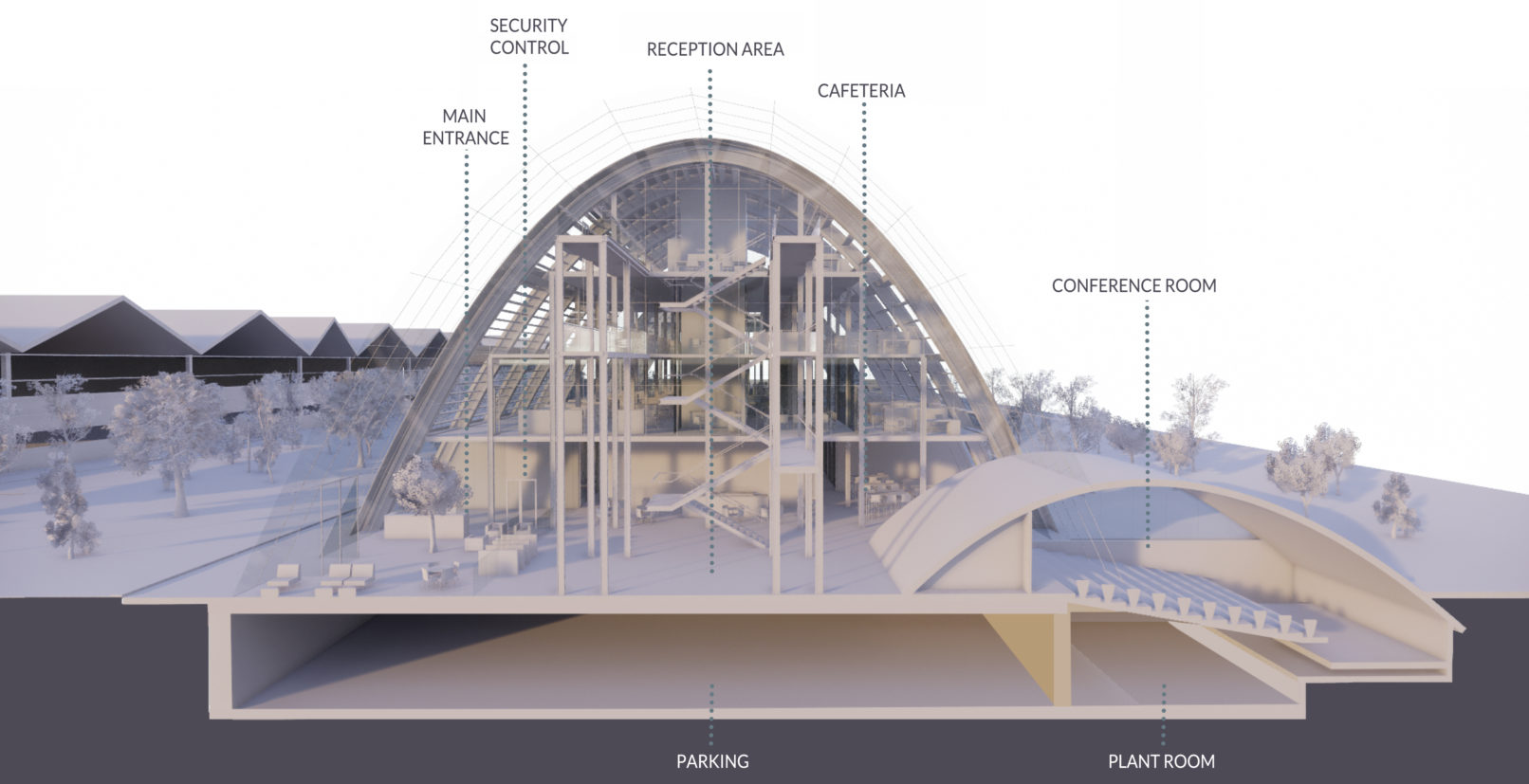 Deliberately moving away from the volume of traditional office buildings, the new complex shows an iconic silhouette, as a reminiscence of industrial hall structures, reflecting the permanent innovation strategy of the Saint-Gobain Group. The building is composed of three large halls with a parabolic profile, the ideal arch geometry under its self weight, connected by two large glazed atriums, as a tribute to Saint-Gobain’s initial core trade.