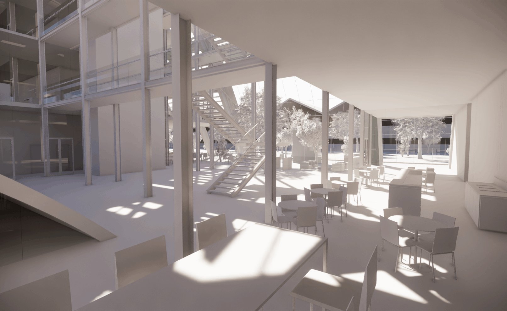 In the continuity of the existing centre, our project aims to develop the current site with the creation of a new office building with a capacity of approximately 350 to 400 people including meeting spaces, a restaurant, a cafeteria and sports facilities. It also houses a 150-seat conference room with a large reception area. Our project proposes to fulfill this ambition by offering a harmonious complex between the existing industrial factory building and the new building.