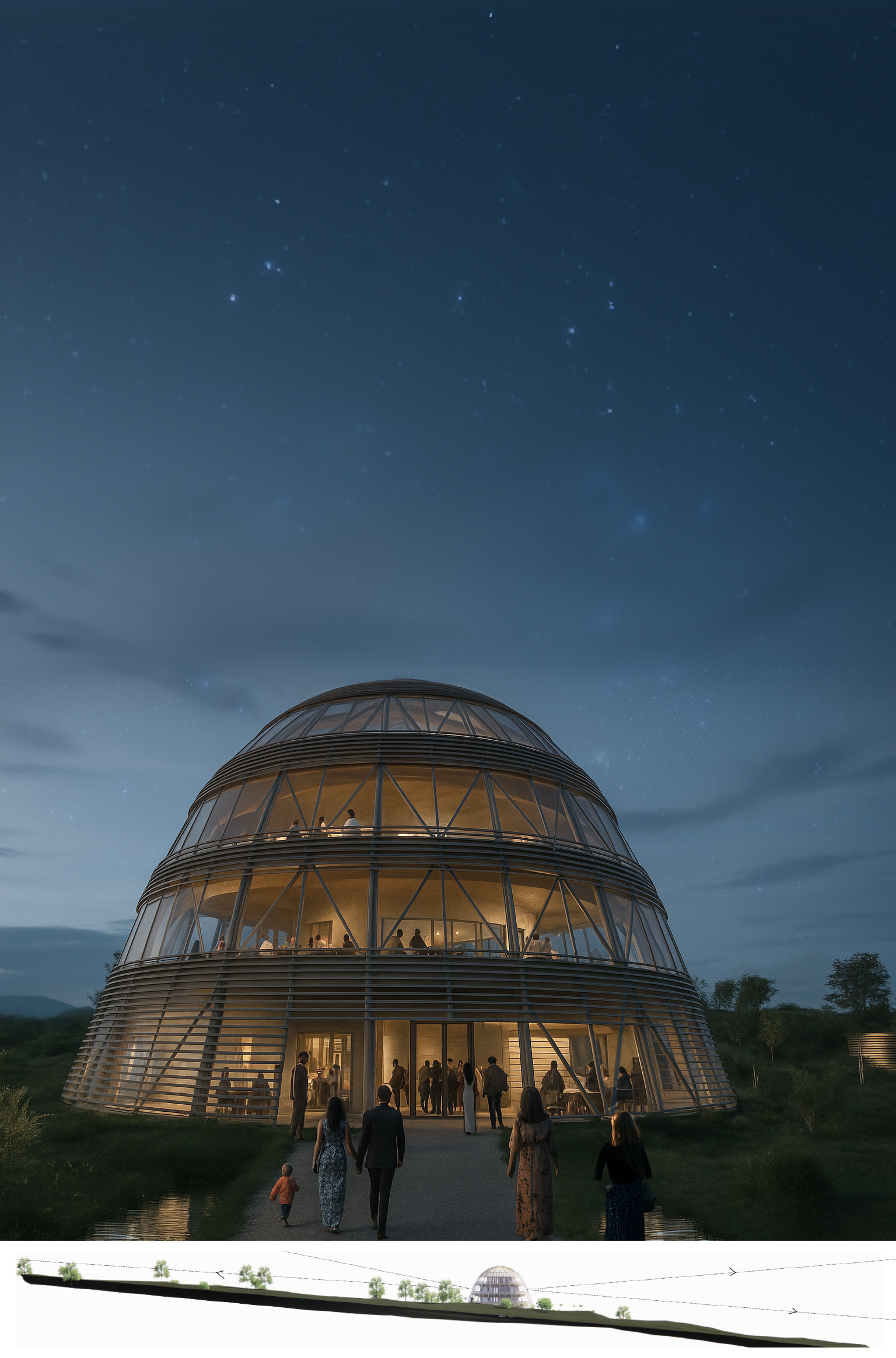 In order to offer the restaurant guests an exceptional 360° immersion experience in the distant landscape during a meal, the new dome is designed to ensure maximum transparency of the building shell. The cultural center, occupying the entire ground floor of the dome, is in direct continuity with the topography of the site. The technical spaces of the building and the kitchens are integrated into a semi-buried base.