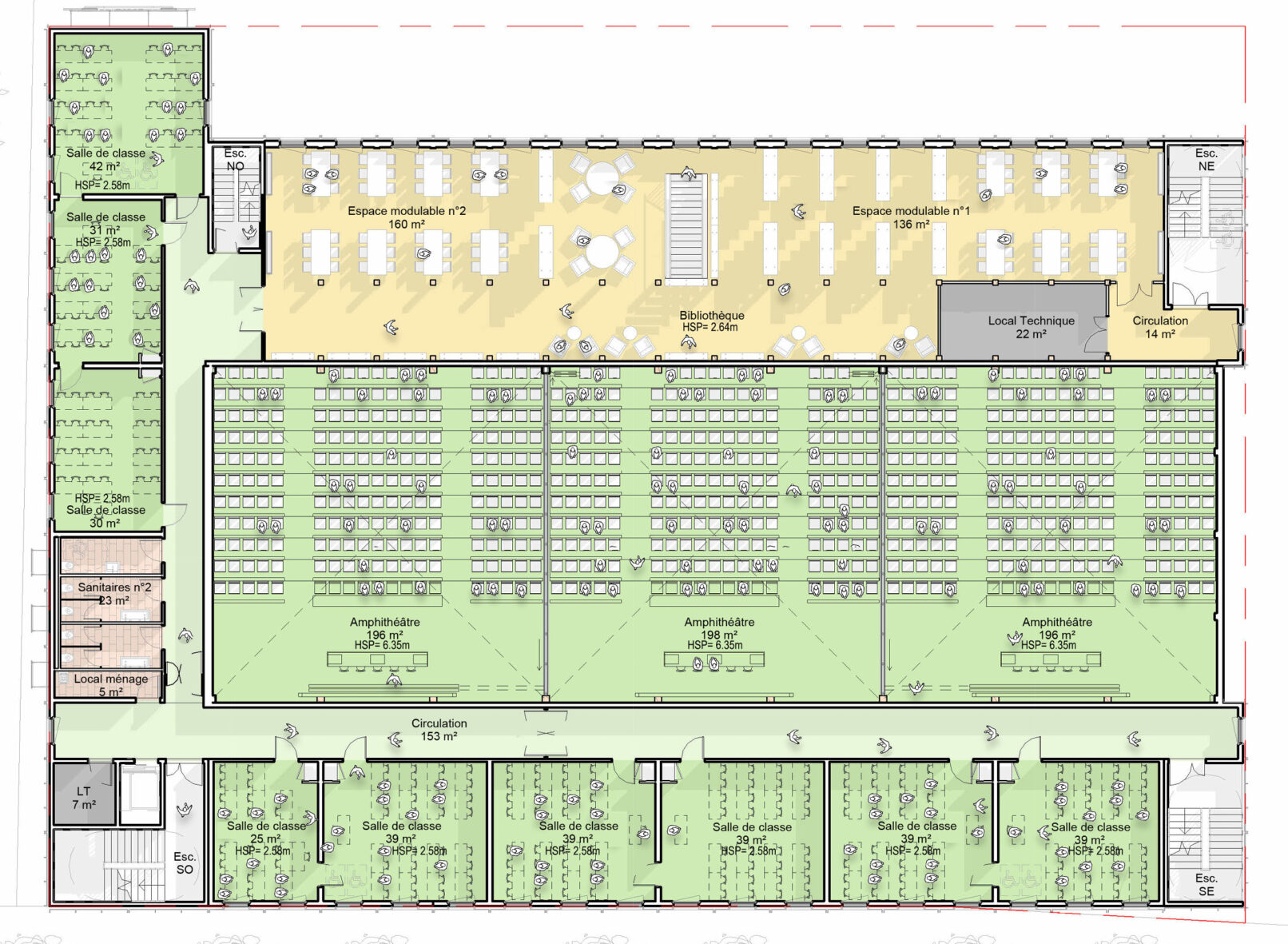 Au cœur du projet, trois amphithéâtres démontables de 200 places chacun peuvent être relocalisés ailleurs sur le campus. Une fois retirés, ils libèrent de grands espaces transformables en plateaux tertiaires ouverts sur un patio en pleine terre.