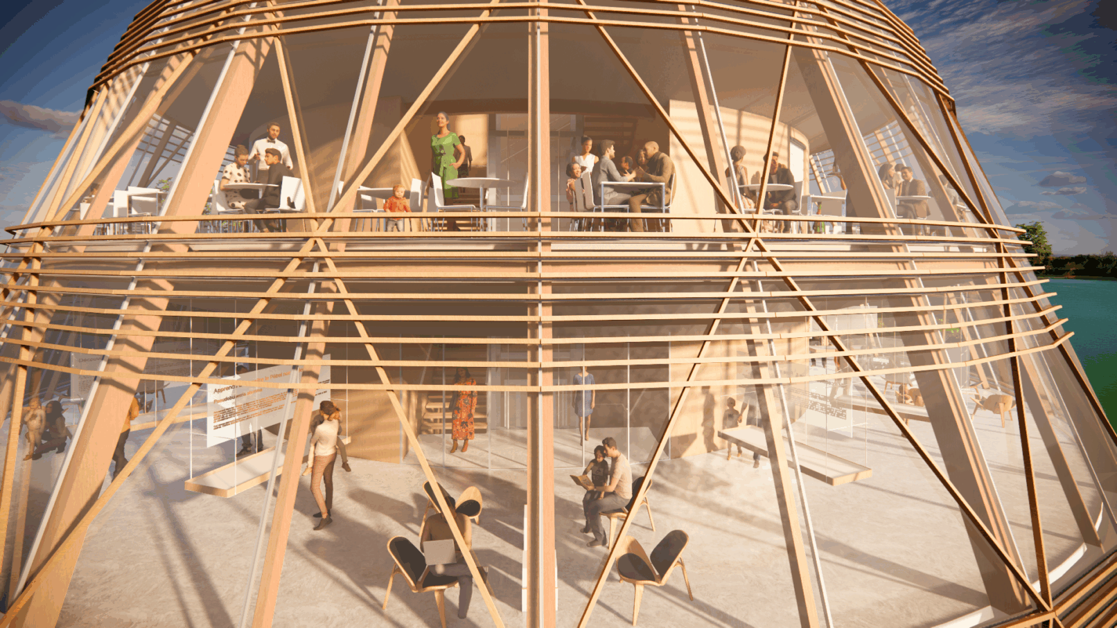 Niché au cœur d’un parc naturel, ce dôme est conçu pour accueillir un écomusée dédié à l’observation de la faune et la flore ainsi qu’un restaurant panoramique tournant sur ses deux niveaux supérieurs pouvant accueillir jusqu’à 400 couverts par jour. Le volume du nouvel édifice s’inspire librement de l’entrelacs des brins formant le nid de l’oiseau bélier.