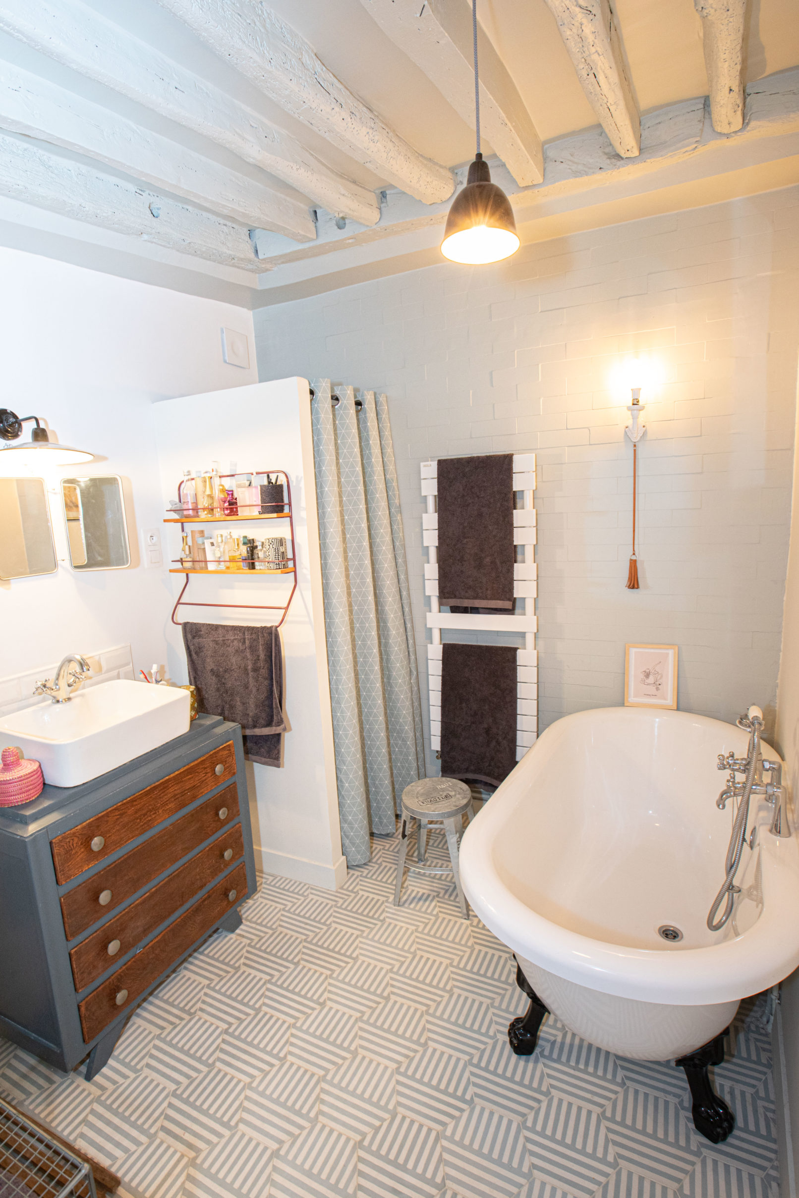 Privilégiant la récupération et la seconde vie, la quasi-totalité du mobilier a été chinée et adaptée si besoin, comme la commode transformée en meuble vasque dans la salle de bain.