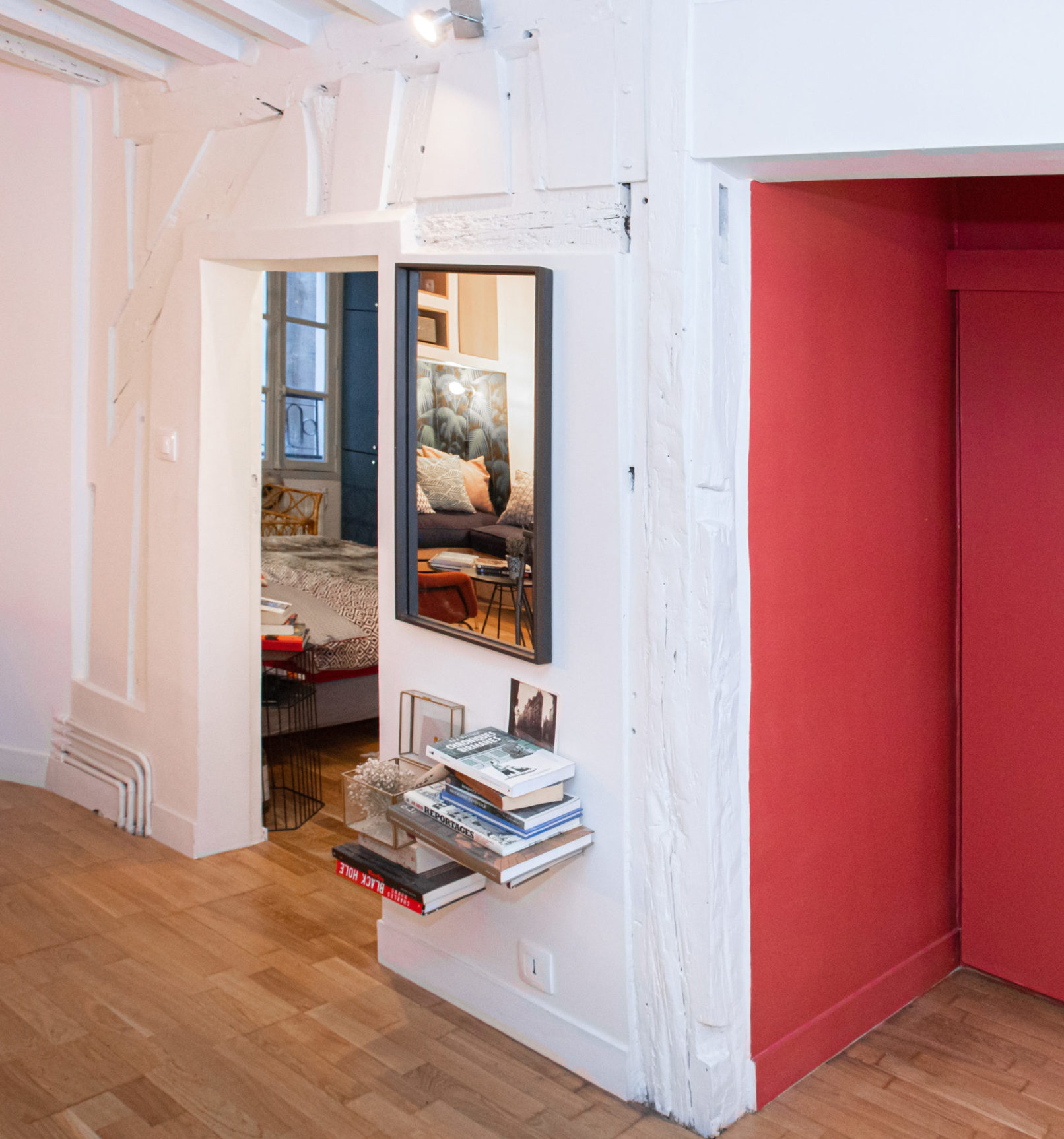 Dans chaque pièce, des menuiseries ont été dessinées et réalisées sur mesure pour tirer partie des volumes et des murs irréguliers en offrant des rangements intégrés. Une banquette a été créée dans l’espace du salon, permettant une assise généreuse dans un plan contraint et dissimulant des coffres de rangements. Afin de délimiter les différents espaces sans pour autant les cloisonner, la couleur a été utilisée par touches dans tout l’appartement au sol, au mur ou sur les menuiseries.